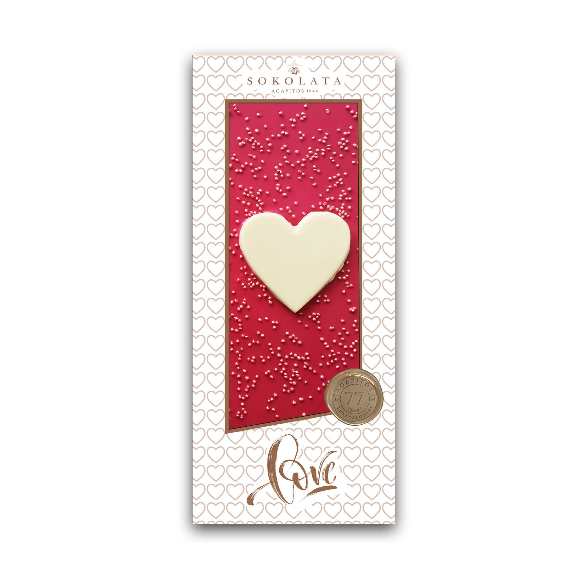 그리스 테살로니키에서 수작업으로 만든 수제 초콜릿, 아가피토스 1944 "아이 러브 유" 바를 맛보세요. 선명한 핑크색 바탕에 화이트 초콜릿 하트가 올려진 이 초콜릿은 최고의 고급 선물입니다.
